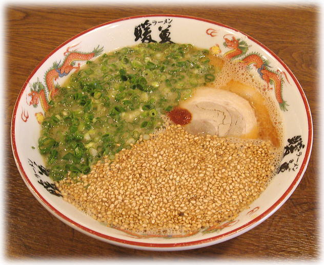 今回は懐かしのネギゴマラーメンを食べてきました。それにしてもすんごい胡麻の量で、むせそうな位ぶちまけてありますねぇ。(笑)そこに通常の2倍の量のネギがトッピングしてあり、普通のラーメンよりも食べやすいです。たくさんの胡麻が薄い豚骨スープの短所を誤魔化していますねぇ。(^_^;)