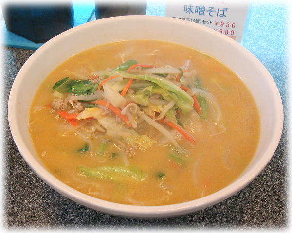 こちらは神田神保町近辺に数店舗あるチェーン店で、店名のとおり餃子をメインに出していますがメニューを見ると麺類も充実しております。13時過ぎでしたがサラリーマンでほぼ満卓状態でした。店員さんが「今日のサービスセットは味噌そばです。」とのことなのでそちらの黒豚餃子(3つ)のセットを注文してみました。