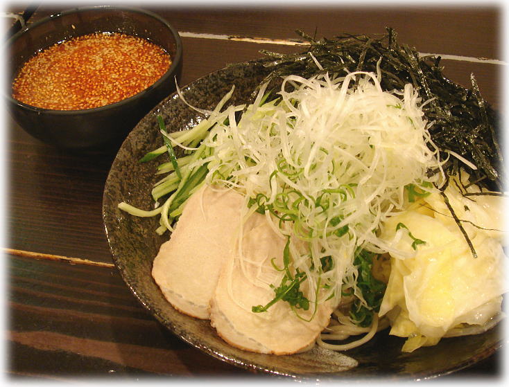 具は大量の刻み海苔(多すぎ)、ペラペラの美味くないチャーシュー、茹でキャベツ、きゅうり、そして大量の白髪ネギで、つけ麺というよりかは冷やし中華の辛い版みたいな感じでした。つ〜か具が多すぎでくどいよ。