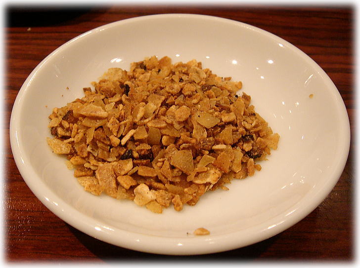 にんにくが好きなかたはカピタンというフライドガーリックを50円で追加して(二人でひとつでも十分な量)それをいれてもいいと思います。わたしは後半に入れて楽しみました。店によっては、この「ぼんしゃん」が無い店舗がありますので公式HPでチェックしてみたほうがいいでしょう。ぼんしゃんは美味いから4点でいいんじゃないかなぁなんて私が言ってると連れが「え〜!それは甘いよ〜!」だって。九州人はさすが豚骨ラーメンにはチェックが厳しかねぇ・・・。(笑)4点でもいいんでないの?(^_^;)