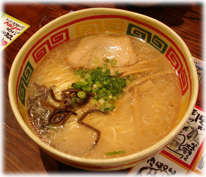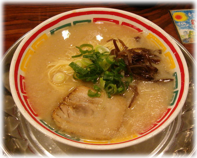 こちらは東京人に博多のラーメンには明太子が乗っているという間違った考えを植えつけたお店かもしれません。(爆)私もその1人で15年位前は原宿店でなにも知らずによく食べていました♪「全部乗せ」(今は東京ではメジャーな言い方ですが多分このお店が最初にこの言い方をメニューに載せたと思います。)という明太子とか角煮とか具が全部乗っているメニューが有名ですが、そもそもラーメンに明太子なんてあわないというか生臭くなるというか、邪道なので普通のラーメンを食べてみました。