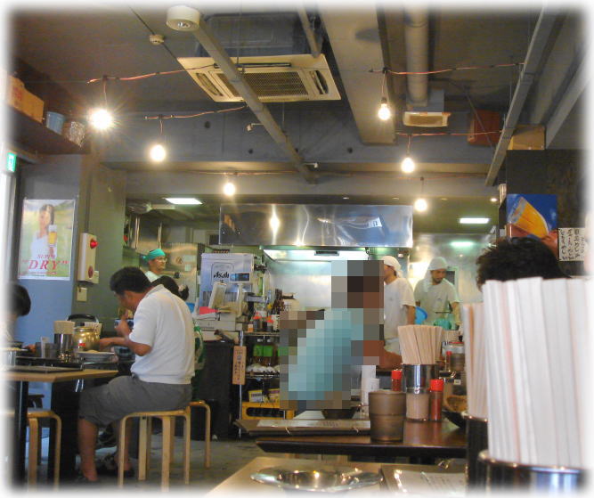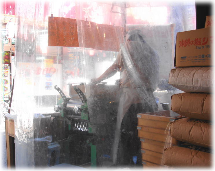 そして、私も暑いのですがもっと暑いんじゃないかと思うのがこの製麺機があるブース?みたいな場所です。入り口の横にありましてビニールカーテンで仕切られていてかなり暑そうなんですけど、ず〜っと麺を作っていました。つ〜かよくわかんないけど、あんなに暑い場所で麺を作って美味い麺なんか出来るのかよ?って思いました。(爆)