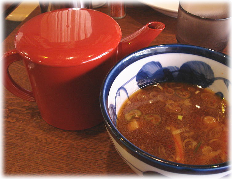 最後にスープ割なんですけど、結構つけ汁が濃い目なので全部入れてもまだ濃い位でした。そういえばココのお店にはスープ割をしてもレンゲが来ないんですよねぇ。味が濃いのでレンゲの上で味を調整して最後は飲みたかったんだけどなぁ・・・。(^_^;)