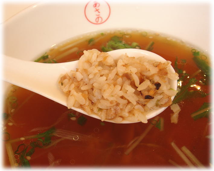 そしてこちらのウリが、残ったスープに麦ご飯をドボンと入れてスープ茶漬け感覚で食べる事を勧めているそうです。最初に店員さんに「かやくご飯と麦ご飯はどっちがいいですかねぇ?」と聞いたんですけどお薦めはかやくごはんでした。でもこちらの「スープ茶漬けの提案」を後から見ると麦ご飯を入れることになってますね・・・。(^_^;) まぁいいや、とりあえずスープに浸してかやくご飯を頂くと、スープ炒飯じゃないけど、まぁそんな感じでなかなか美味しいじゃないですか。結構お薦めかもしれません。私は普通盛りにごはんドッポンだったので量は足りましたけど、ラーメンはどちらも量が少なめなので男性の方は大盛りで頼んだほうがいいと思います。