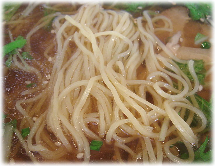 一方冷やしラーメンの方は味が若干濃い目で胡麻油がほんの少々きいておりこちらの方が万人受けする味でしょうか。麺は硬めに茹でられた縮れた中麺でコシがありなかなか美味しいです。具には水菜、メンマ、ワカメ、そして鶏のささみが入っておりこのささみはこのラーメンには合っているような気がしました。