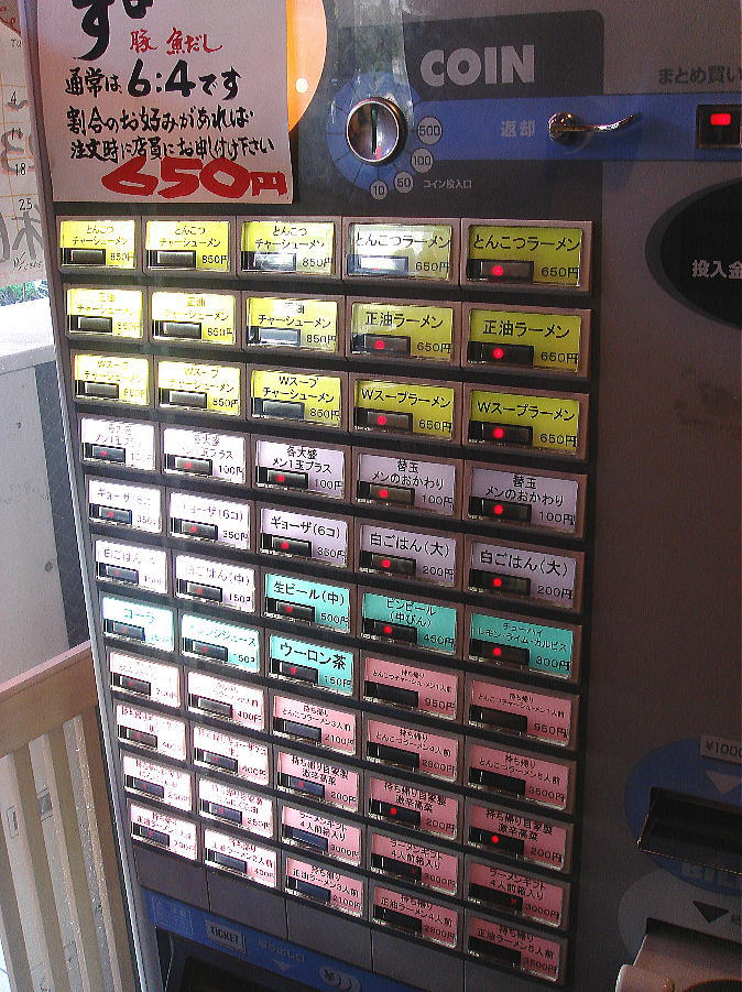 日曜日のお昼時に行ったのですが行列は無くすんなり入れました。食券機で「とんこつラーメン」と豚骨と魚ダシが入っている「Wスープラーメン」をシェアしてみました。