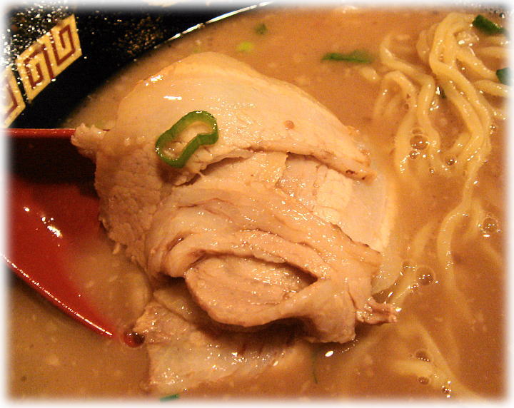 具には海苔、メンマ、シャキシャキの青ネギとチャーシューで、チャーシューはトロトロに柔らかくて結構美味しく頂けました。まとめますと、インパクトだけなら満点でしょう。(爆)しかしながら人を選ぶスープと言うか、ハマればハマりだめな人は初回でノックアウトなタイプですな。