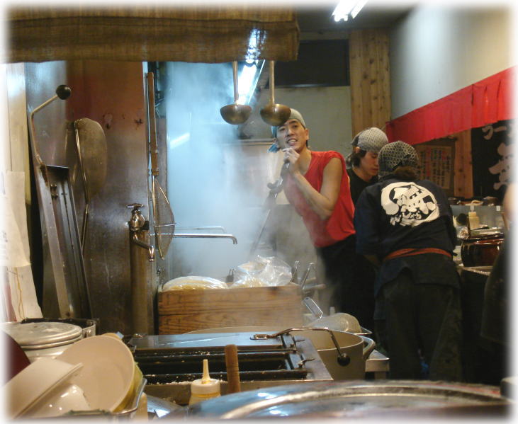ちなみに普通で頼むと「豚骨6の魚4」の割合らしいです。厨房では店員さんが一生懸命羽釜鍋の豚骨スープをかき混ぜていました。