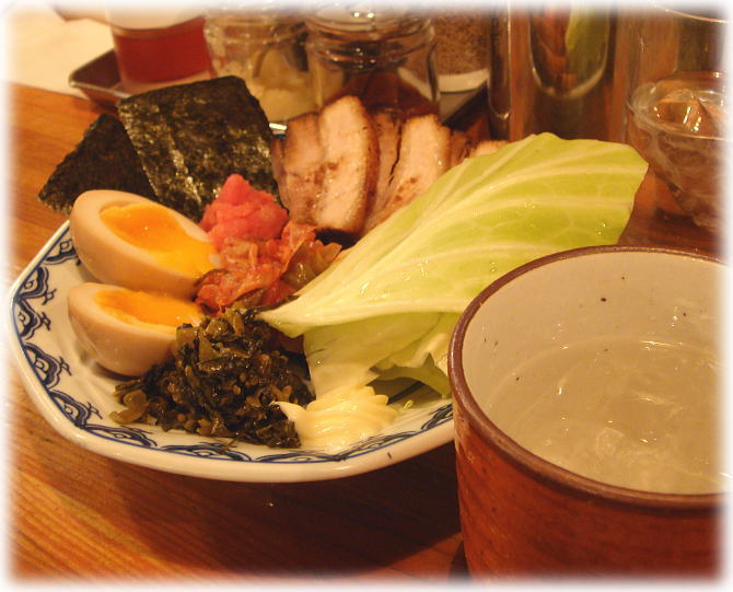 つまみの盛り合わせは「ラーメン全部入りの麺とスープ抜きで!」みたいな感じで(爆)色々なトッピングが盛り合わせになっています。小振りの一口餃子はパリッとしていてなかなか美味しいですよ。思わず芋焼酎が進む君ってもんです。(^_^;)