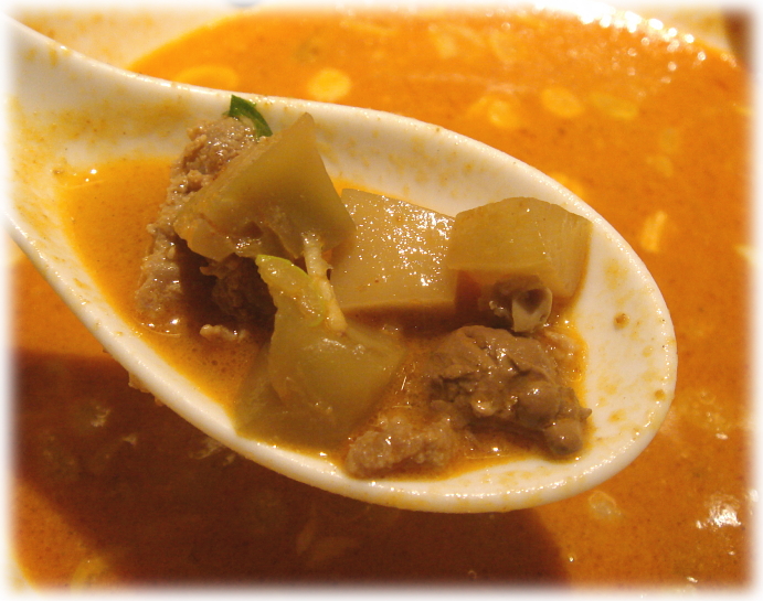 麺はストレートの中麺で加水が少な目のボソッとした麺でして、茹で具合が若干ゆるいですけどスープとの絡みは悪くありません。このスープに刀削麺を合わせたら面白いんじゃないかなぁなんて思いました。