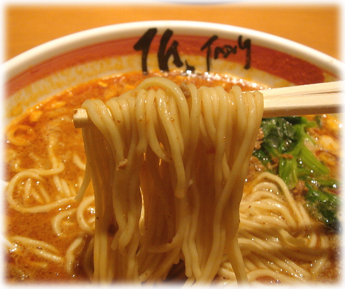スープは辛いといえば辛いんですけど「ヒーヒー」言うような辛さでは無く心地良い辛さで、胡麻の風味の後に花椒(山椒)のビリビリ感がたまらないです。舌がビリビリくる位凄いんですけど、この刺激がいい感じに食欲を沸きたてるので気に入りました。