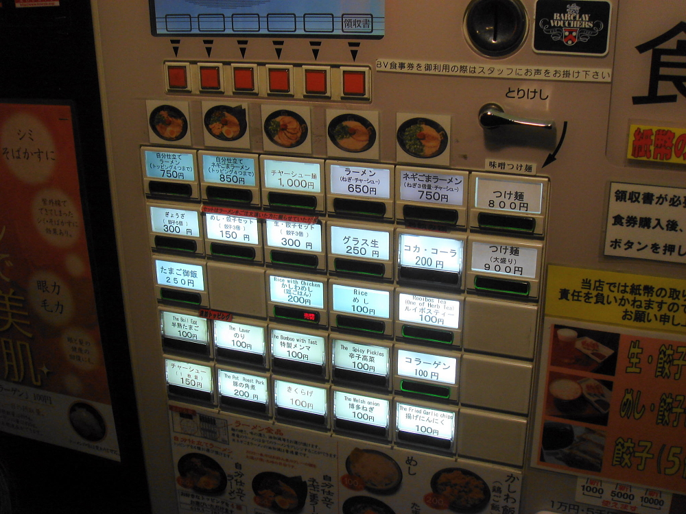 食券機を見ると「自分仕立てラーメン」とかいうのが左上の法則上ウリみたいですけど、チャーシューとネギだけの基本のラーメンのボタンをポチっと押しました。後から気がついたんですけど「つけ麺」があったんですねぇ。そっちにすればよかったかな・・・。(^_^;)