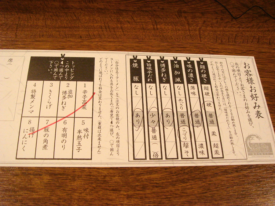 着席すると「お客様お好み表」とかいうオーダー表にこんな感じで書き込み、店員さんに渡しました。
