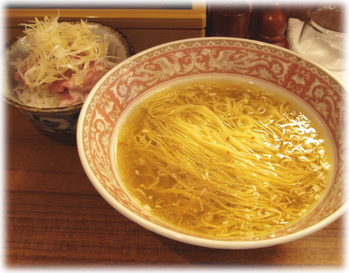 サイドのネギ塩チャーシュー飯は薄切りの柔らかい生ハムのようなチャーシューの上にネギ、そしてぽん酢ダレが掛かっており、さっぱりと食べられてこちらも美味いですよ。単品で両方頼むよりも100円安い昼限定のセットですけど、まだまだ割高感は否めないかなぁなんて。