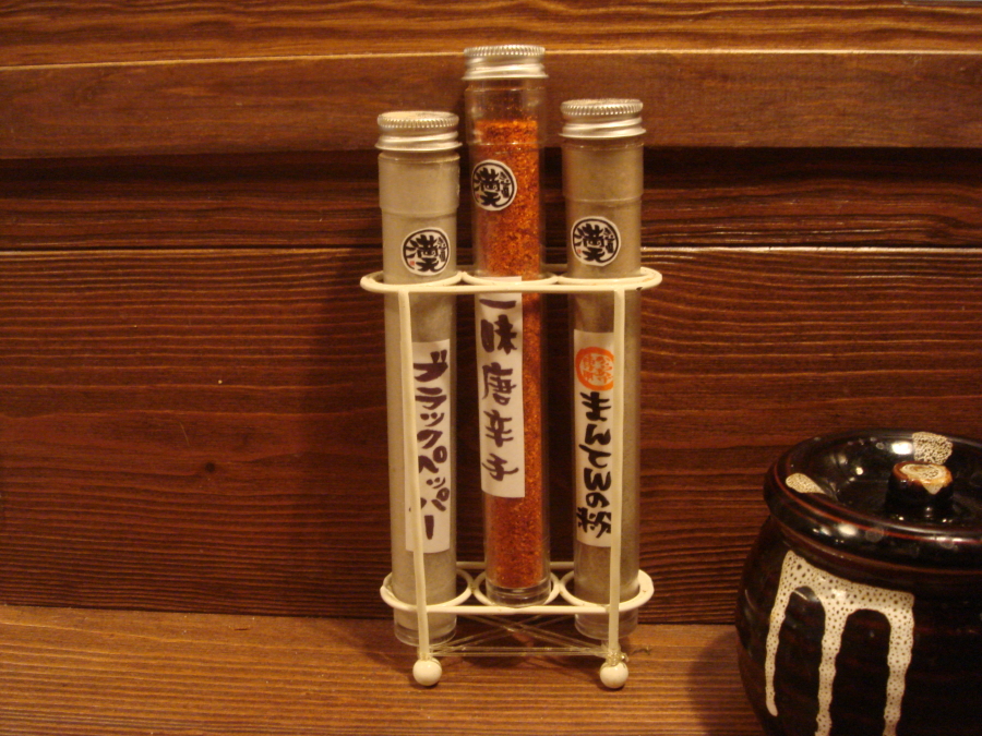卓上にあるオリジナルのニンニク醤油や唐揚げ専用の「まんてんの粉」をかけて美味しく頂きました。