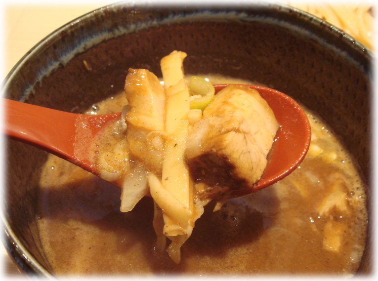 一方、普通のつけ麺よりも味玉、穂先メンマ、チャーシューが多い特つけ麺はどろり〜んとした豚骨魚介で、かなり味付けが濃いめ。最近こんなのばっかなので新鮮味に欠けますけど、まぁこれはこれでたまにはありかなぁ。