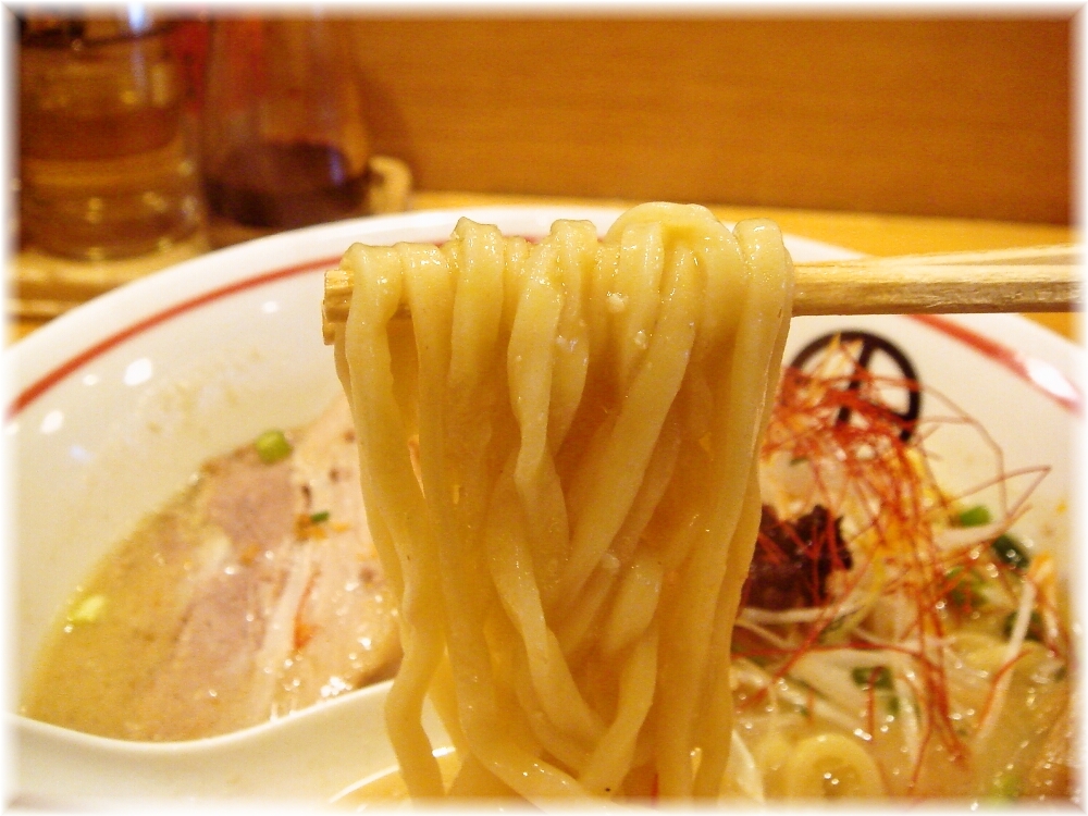 麺は平打ち風の太麺で、力強さとしなやかさを兼ね備えたハイブリッドタイプ。スープとの絡みも上々でこちらもいいじゃないのよ。