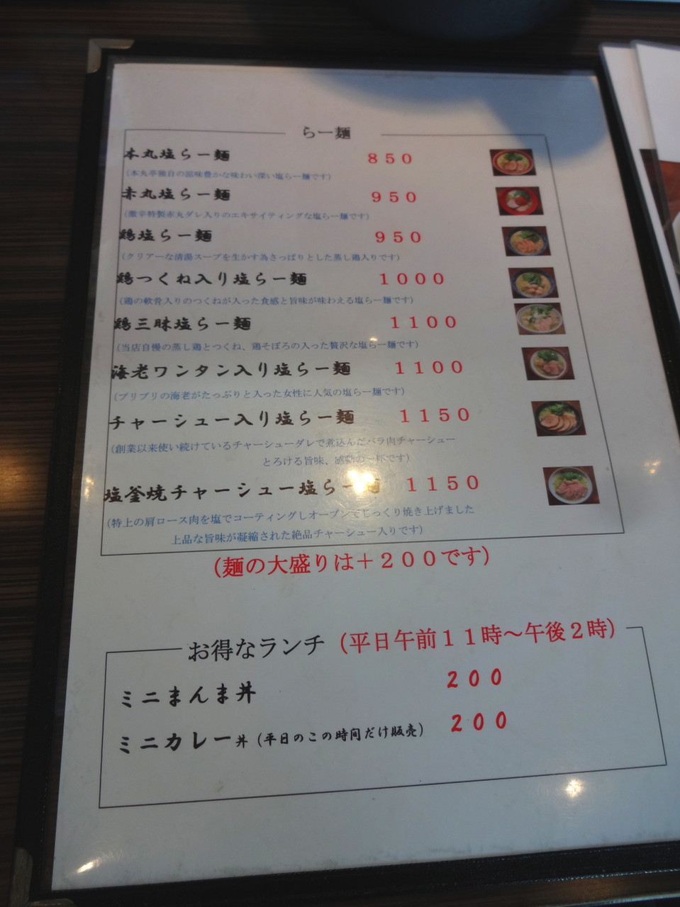 本丸亭と言えば塩ラーメンで一世を風靡したかつての名店でございます。(^_^;)そんなこちらは良く知らないですけど内部で色々あったのか、「本丸亭」では無く「厚木本丸亭」という店名になっておりまして大人の事情があるようです。(^_^;)