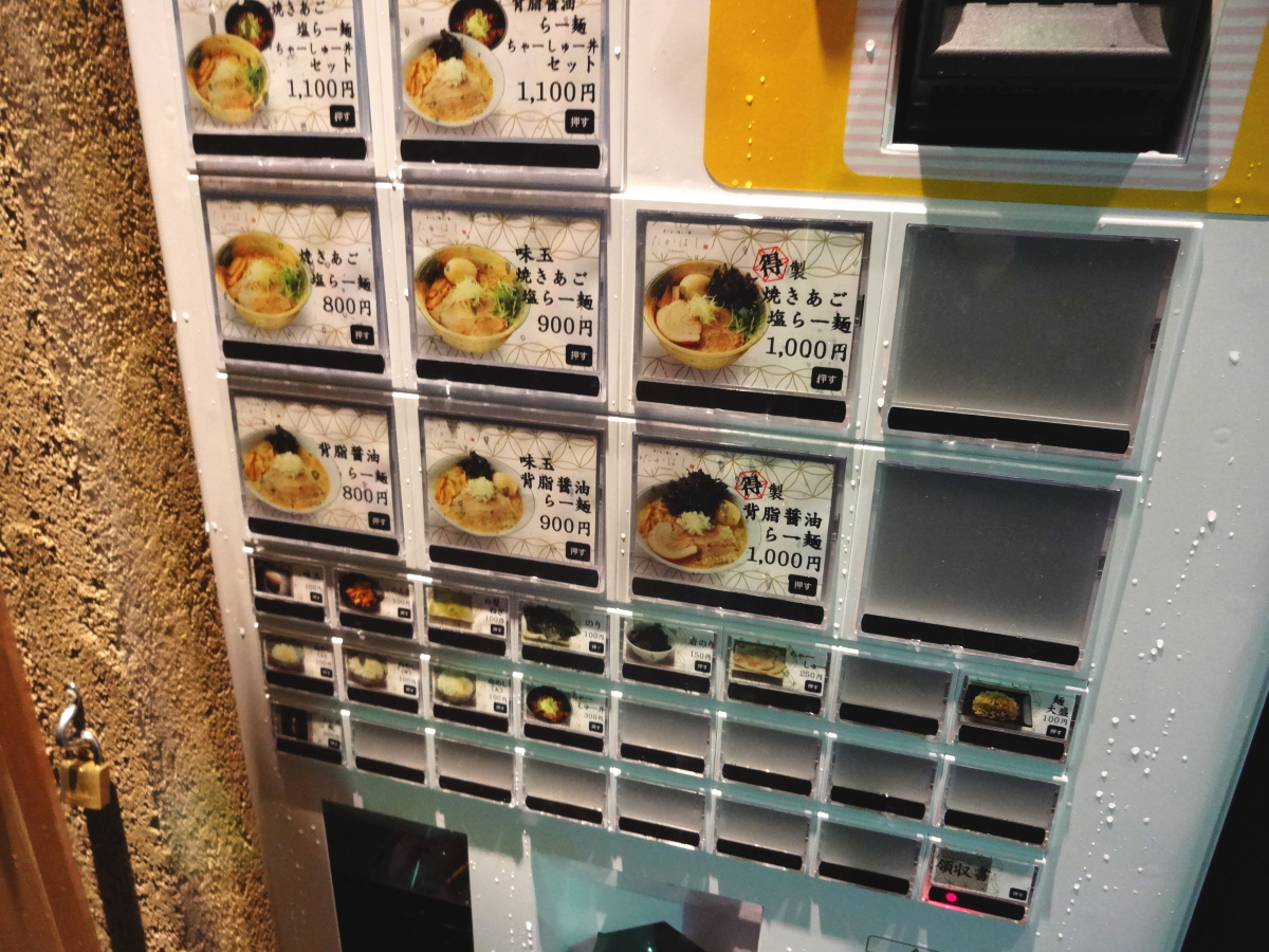 店の外に券売機がありますのでそちらで「味玉焼きあご塩らー麺」のボタンをポチー。