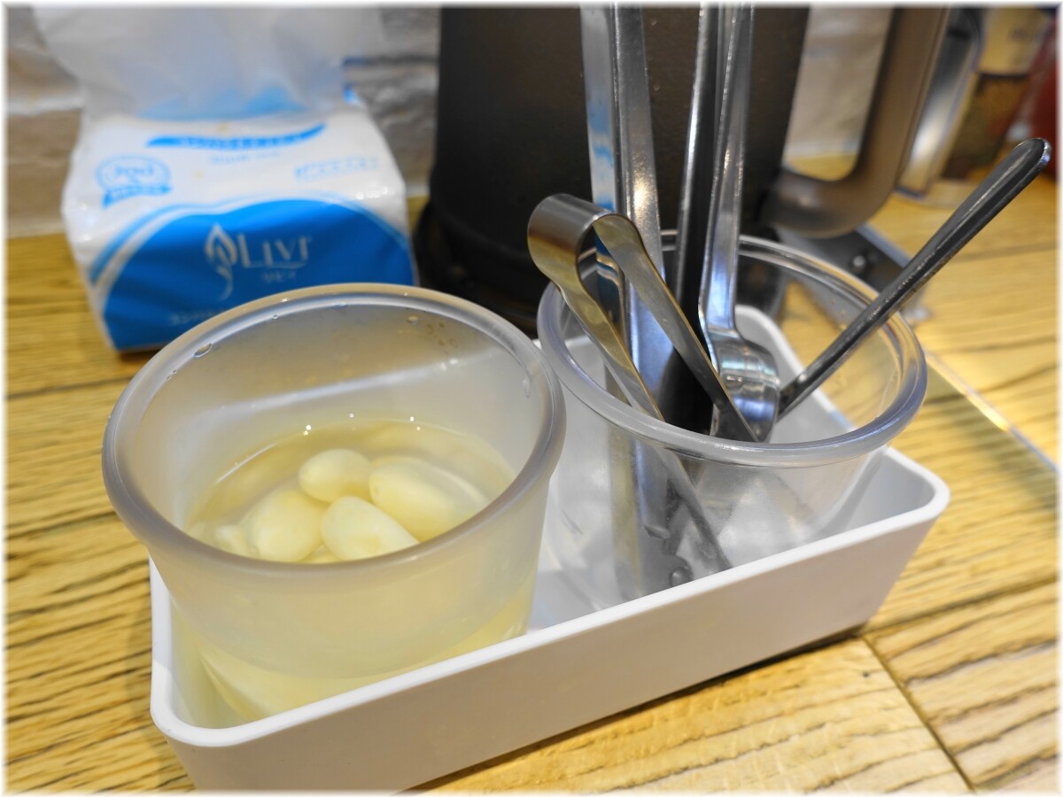 甘みは無くシャープに醤油ダレがきいたスープですがちょっと物足りないのでニンニクをいただいてクラッシュザガーリック&辛いの(あぶら唐辛子)をぶっ込んでワイルドに味変。