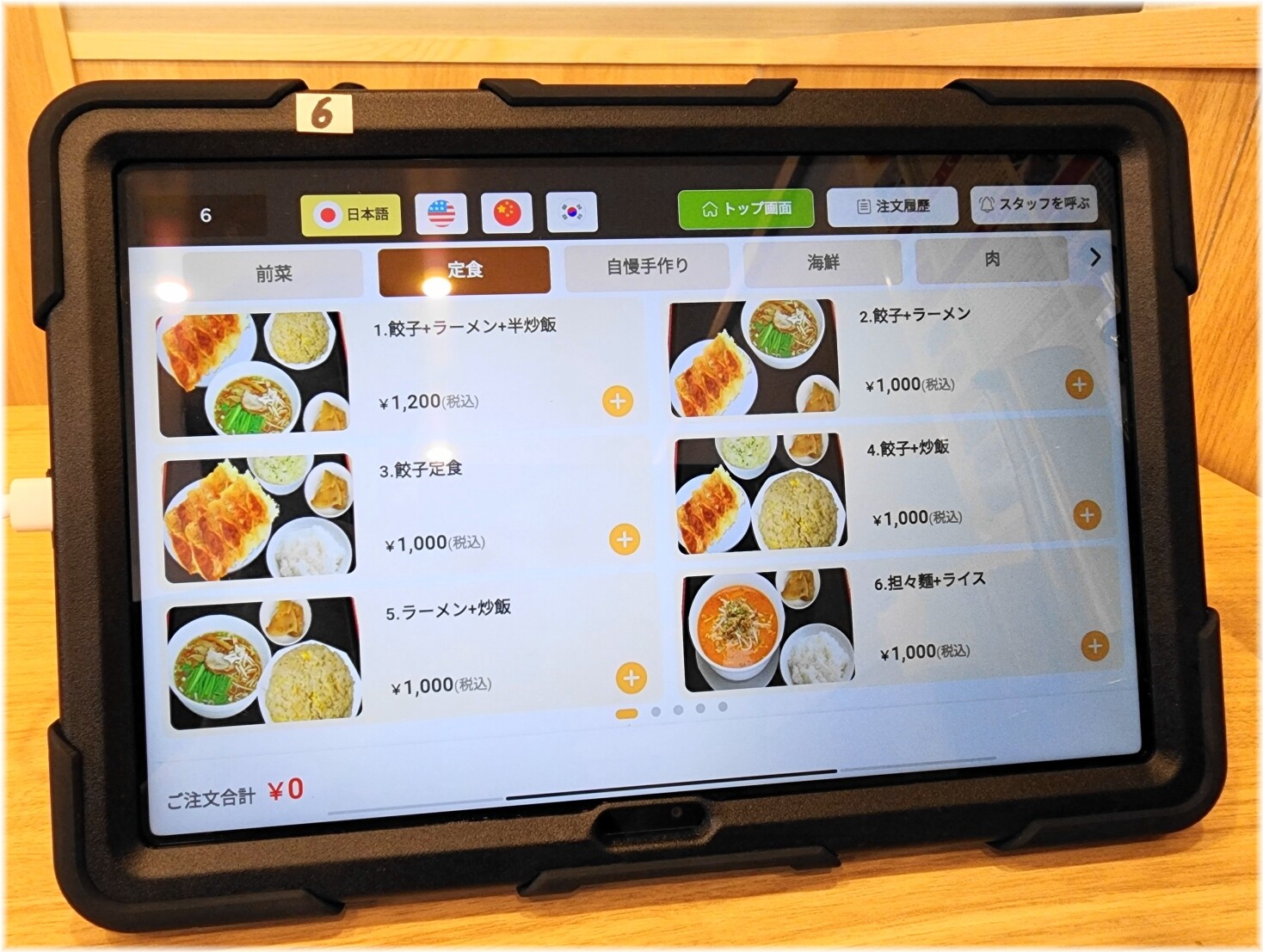 タブレット注文にて、「餃子+ラーメン+半炒飯」のセットをお願いしました。