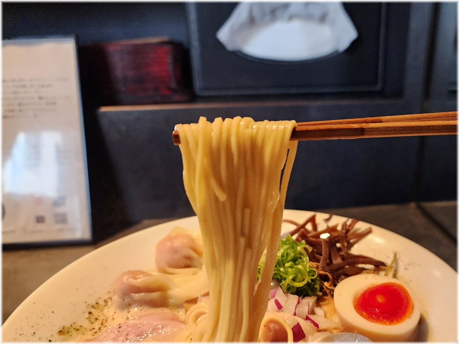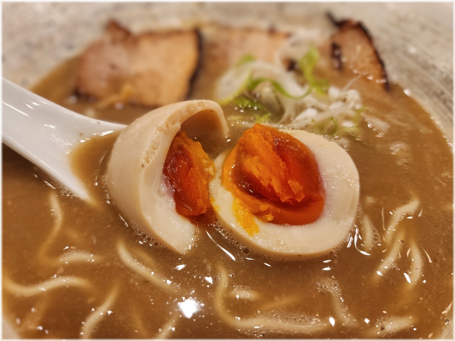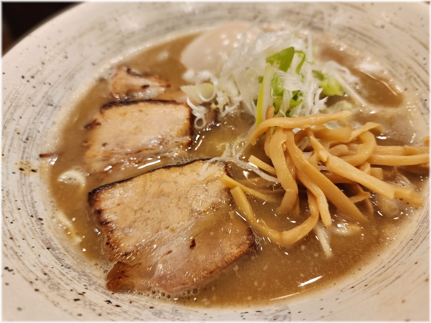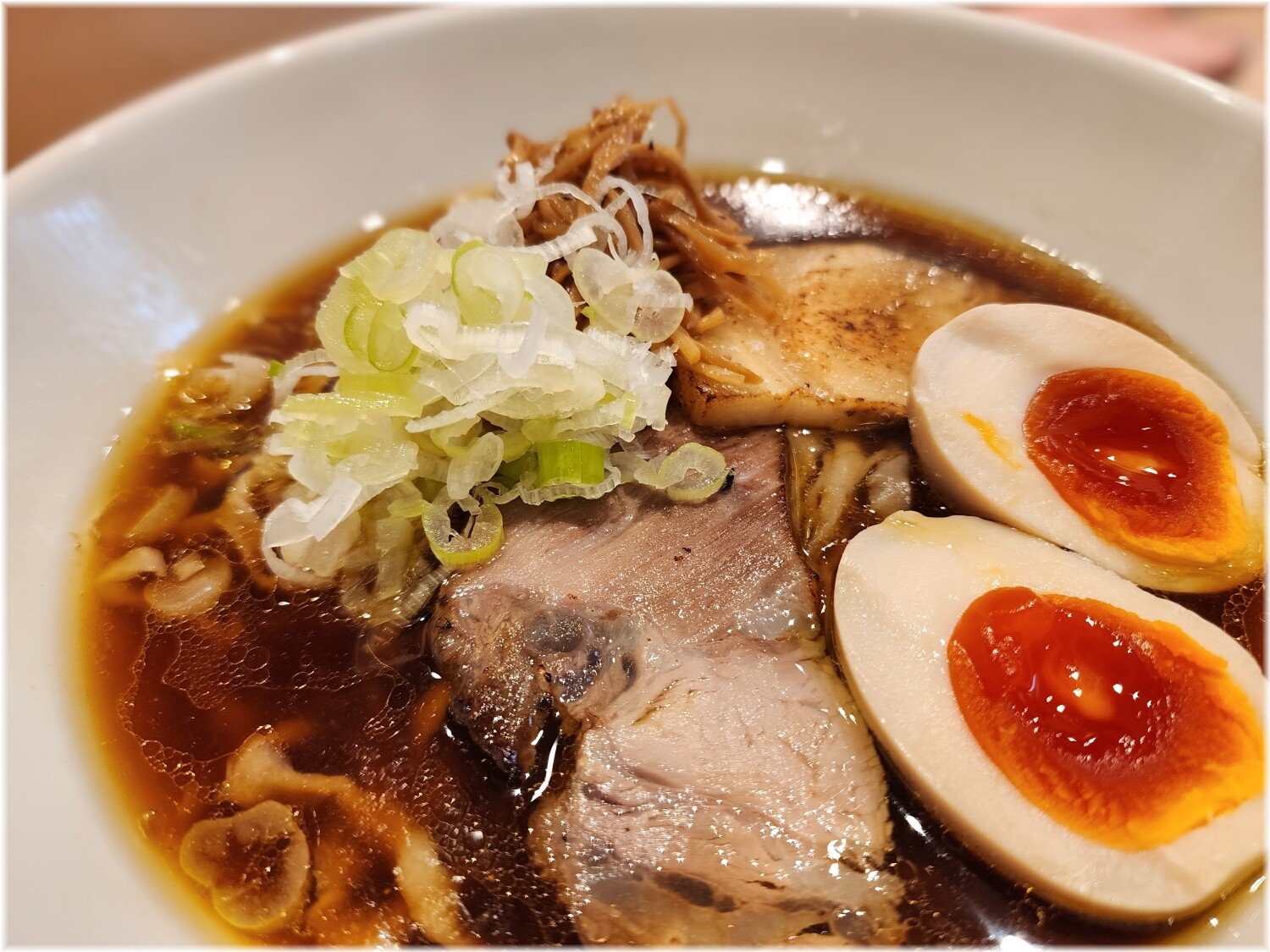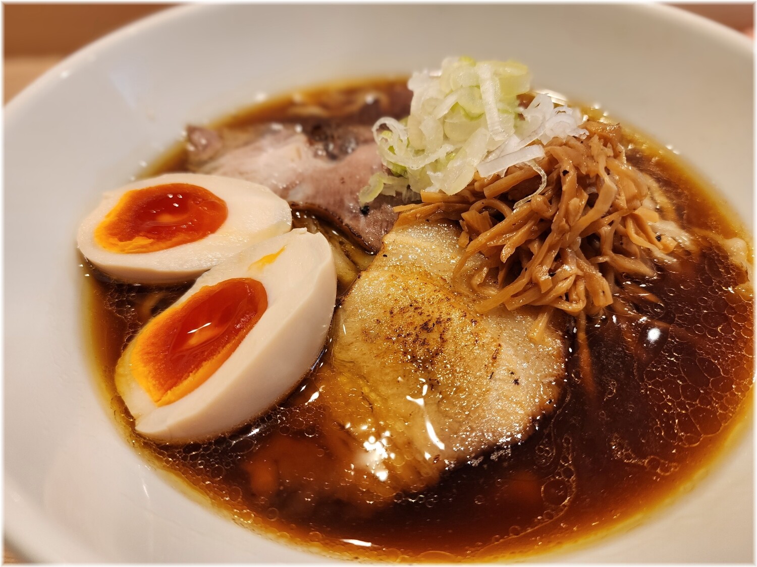 具にはネギ、香ばしい炙りチャーシューや細切りメンマ、いい塩梅の味玉等。
