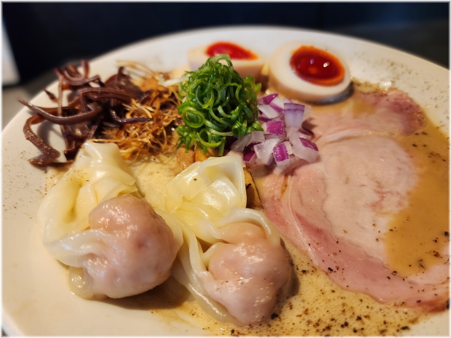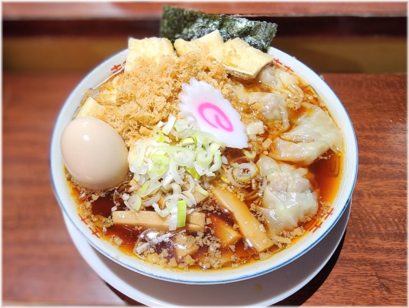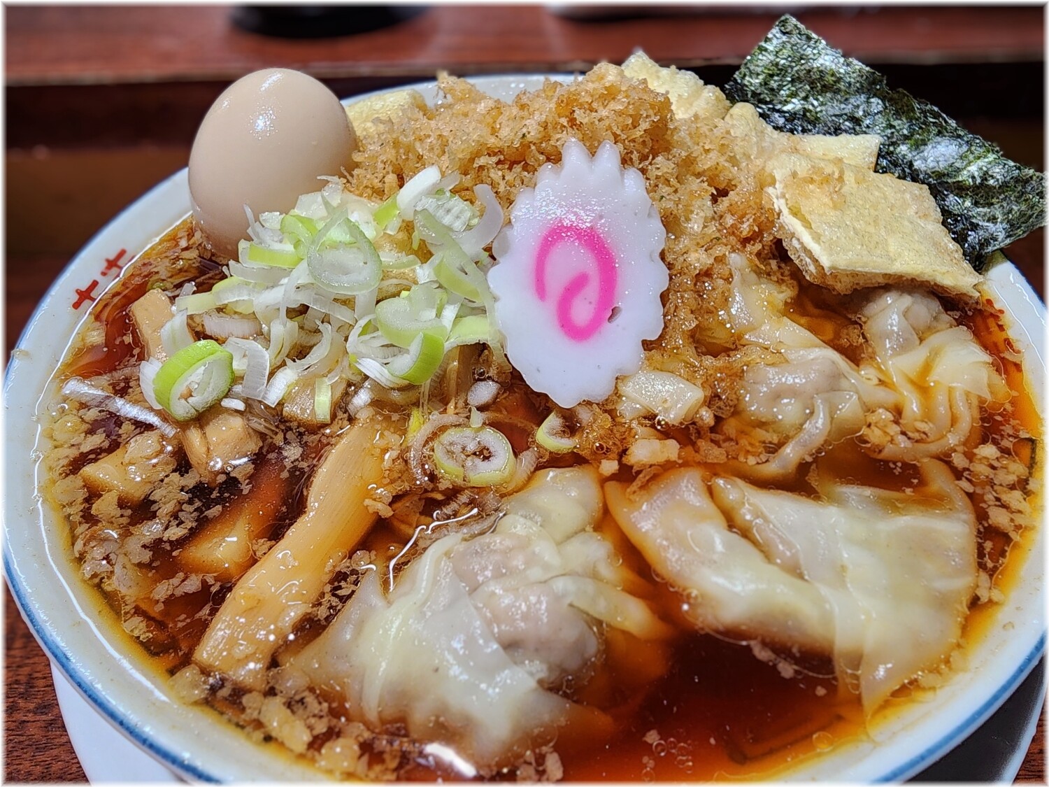 他にはネギ、煮玉子、チャーシュー3枚、メンマにワンタンまで入っていて具の多さはピカイチ。