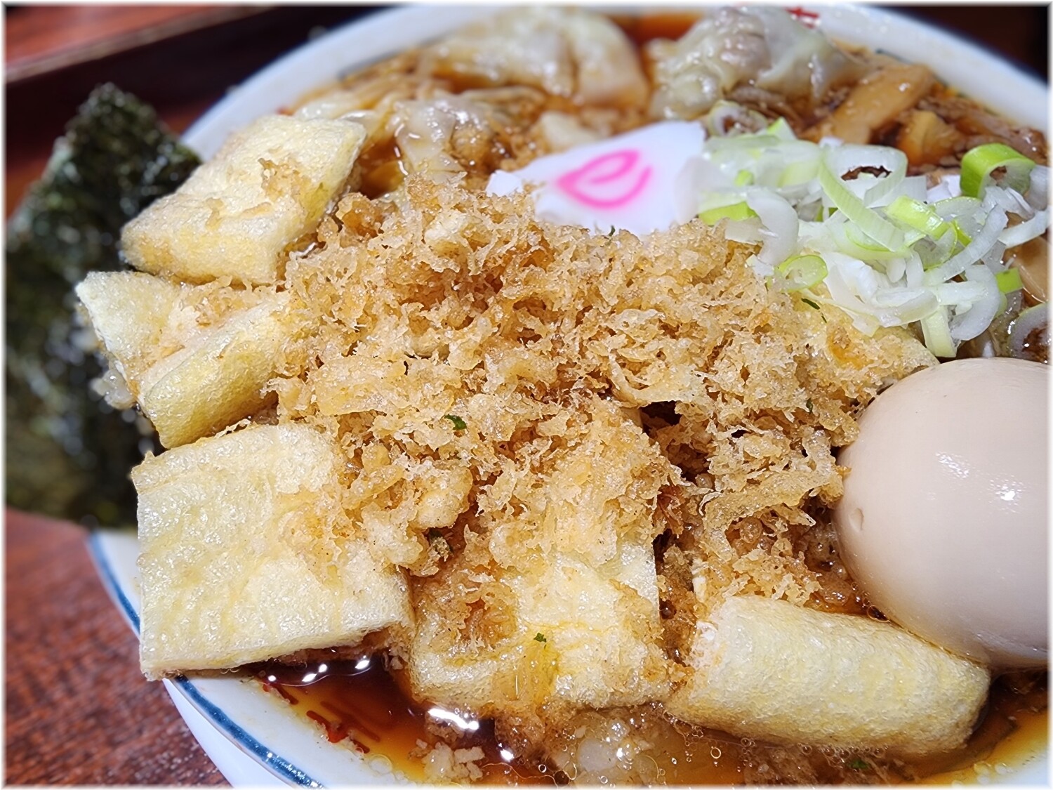 一口お揚げや天カスが沢山乗っておりまして、お蕎麦やうどん流に言えばきつねとたぬきの合盛りで「むじな」って感じでしょうか。