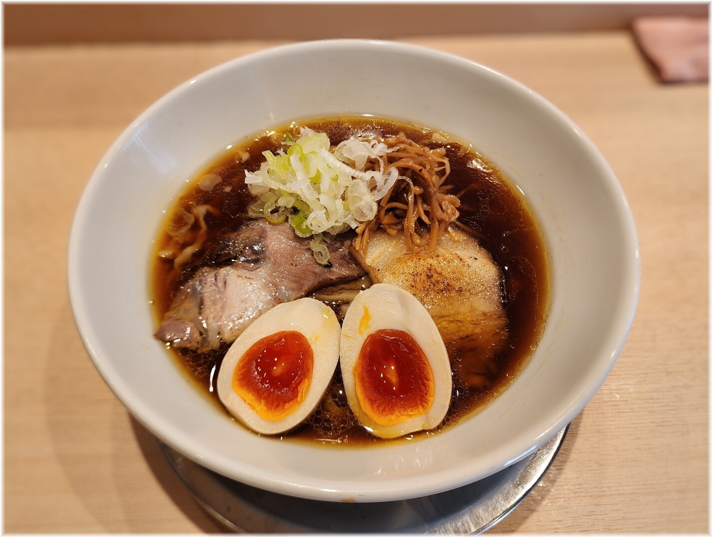 メニューは塩もあるみたいですけど初めてなので醤油の味玉中華そば(炭火つるし焼きチャーシュー2枚)をお願いしました。