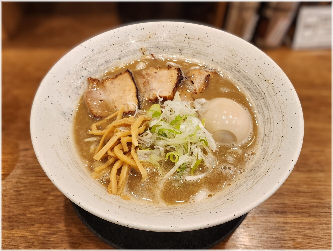 「極濃」は煮詰め直したドロドロ系らしいのでそちらはそれ系がお好きな方に任せて濃厚豚骨の味玉トッピングをお願いしました。