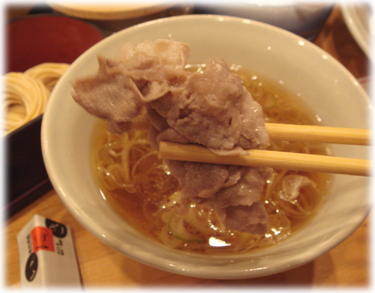 うひょ〜、見るからに美味そうですねぇ。このお肉をしゃぶしゃぶしてタレに付けて食べるんですけど、こちらではそばつゆのようなスープに浸して食べるんです。