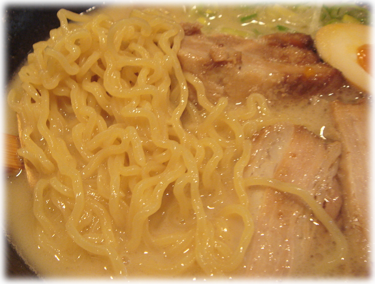 麺は若干硬めに茹でられた、中太の縮れ麺で、このクリーミースープにはなぜかあっていたように思えました。なんでだろう?wそして、印象に残ったのは角煮のように分厚いチャーシューで、これが柔らかくて美味い!