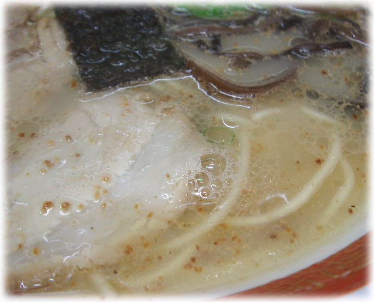 出てきたラーメンは表面にニンニクパウダーがどばっと振りかけてあり見た目が凄い事になっています。(笑)比較的ライトなスープはあっさりしていて、ちょっと豚骨が薄っぺらいような気がしました。