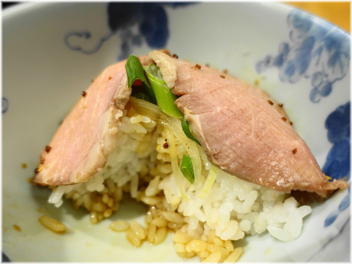 お肉のっけご飯はライスの上にスライスオニオン、その上にローストポークが乗り、酸味あるタレがあっさりしていてなかなかいけましていくらでも食べられそう。