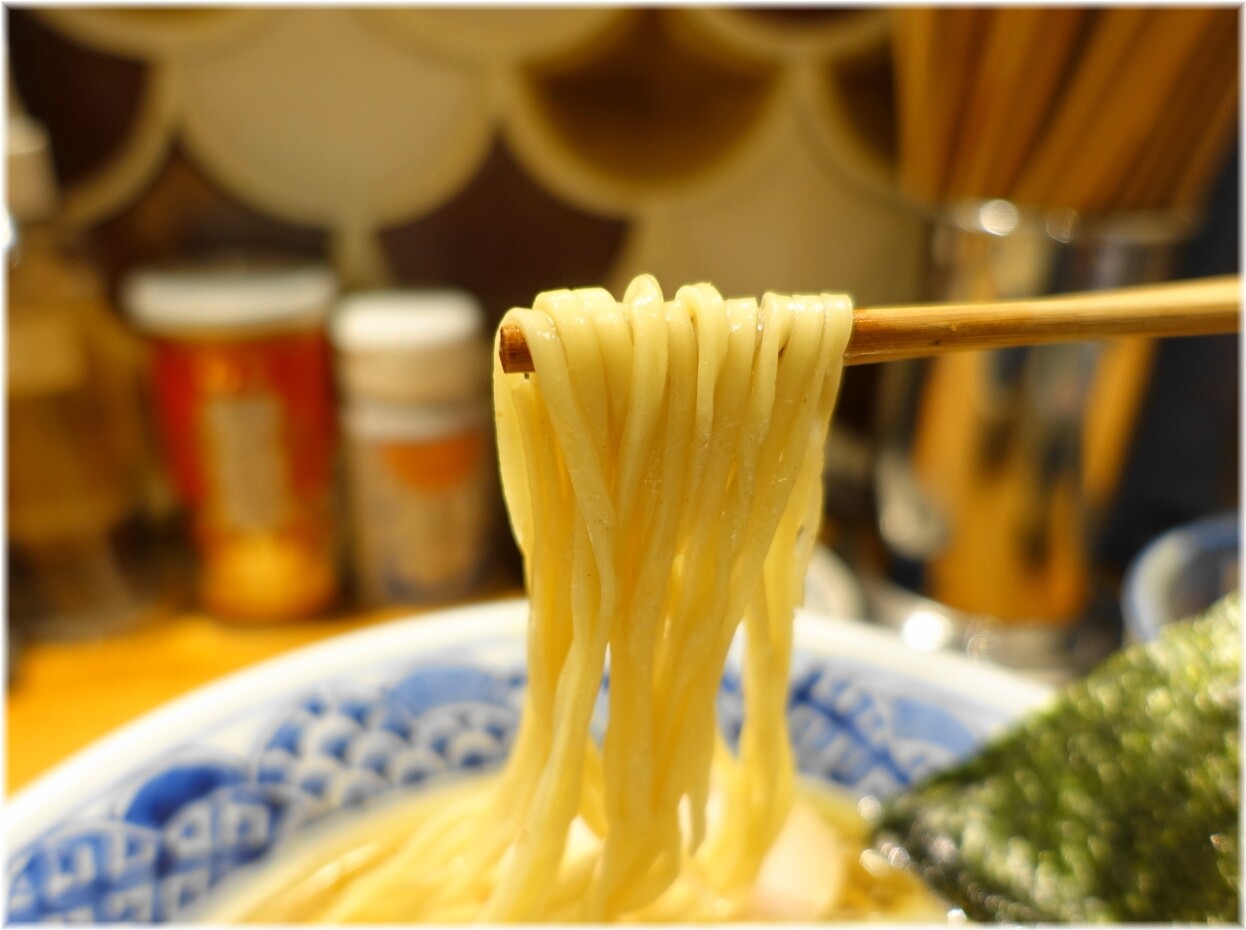 麺は平打ち風のコシのあるストレート麺でムチっとした食感。