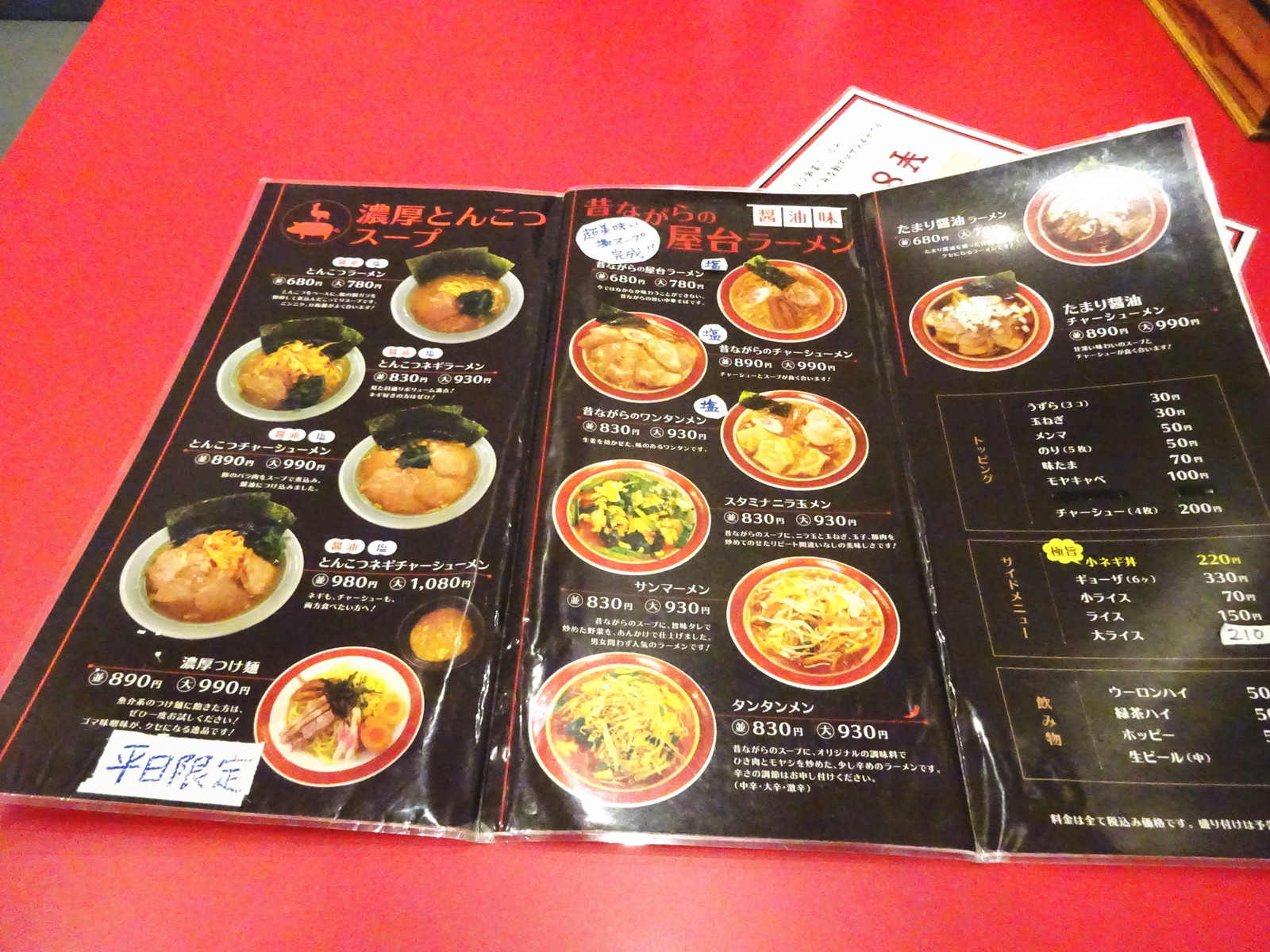 メニューは家系になる豚骨醤油や豚骨塩、昔ながらの屋台ラーメンからたまり醤油ラーメン等色々あり過ぎますな。(^_^;)