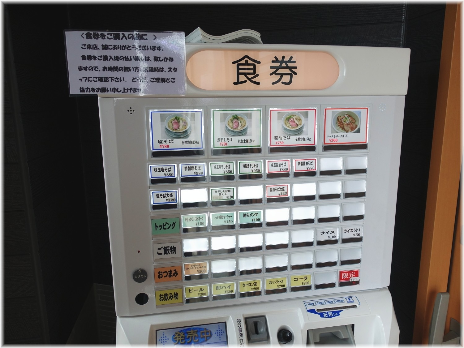入口の券売機にて特製塩そばのボタンをポチり。